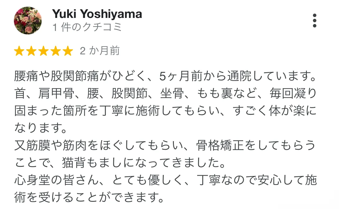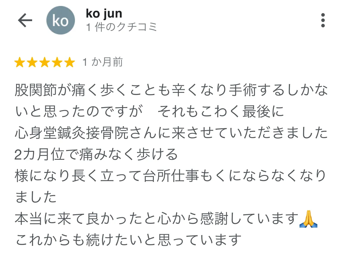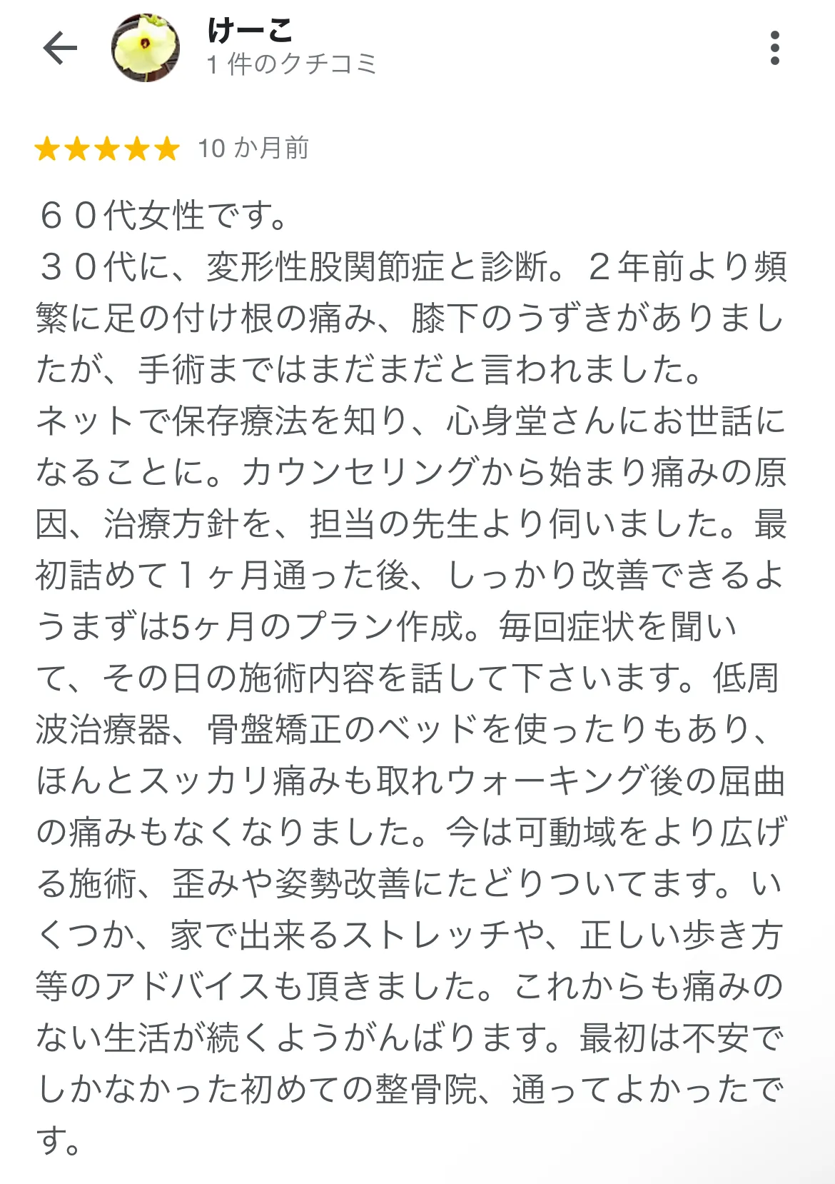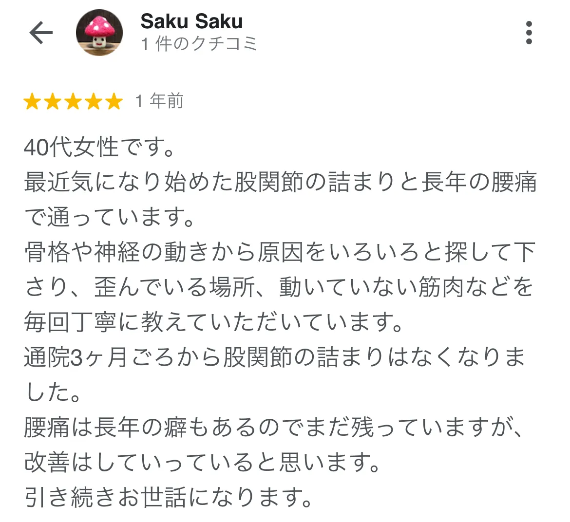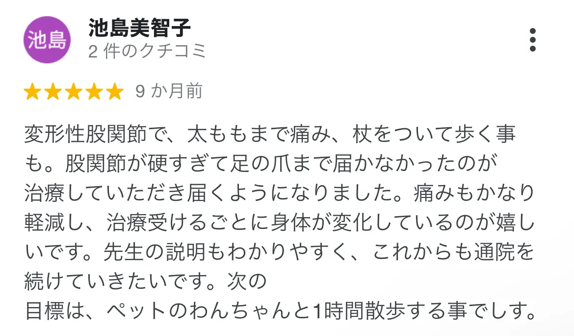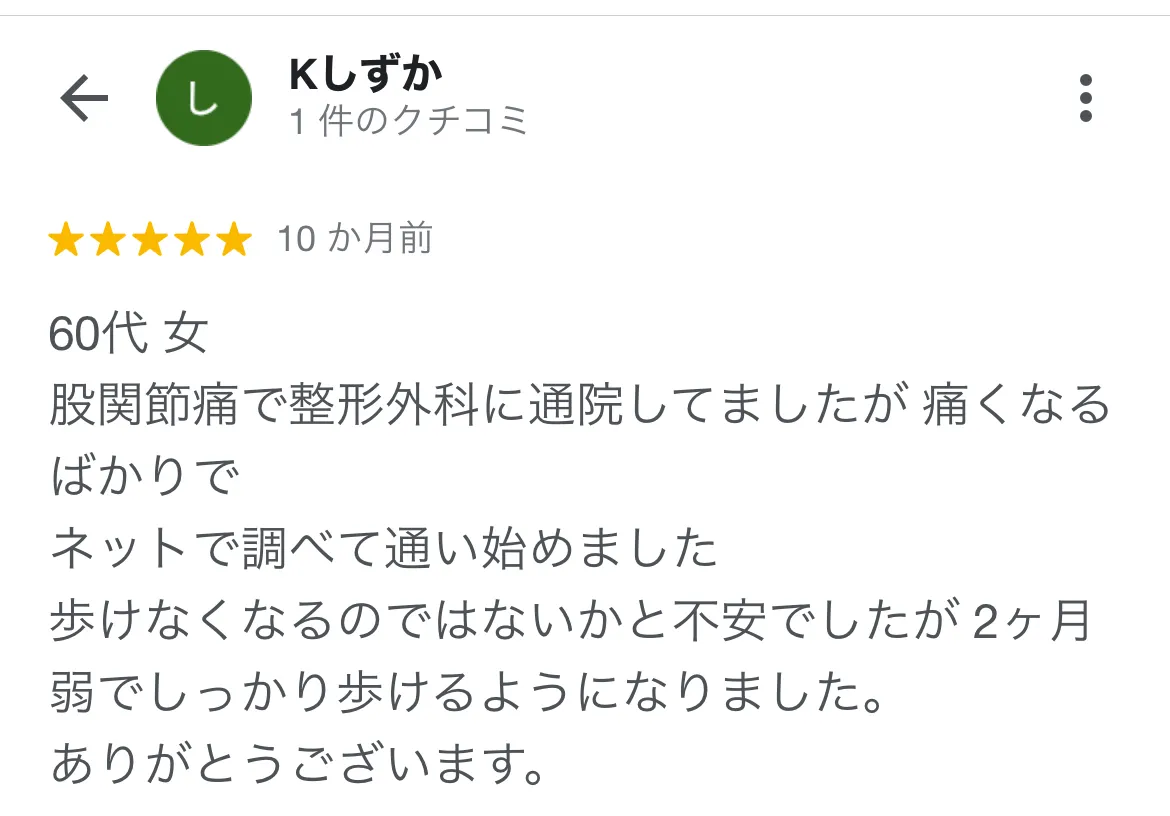 ウォーキングやフラダンスの後の股関節痛に悩まされていました。自分でストレッチをしてみたりしても改善されず、ネットで検索してテスト整骨院さんに出会いました。 根本的な原因に対する施術で、痛みはなくなりました。また、たまに痛みが出てしまった時も、教えていただいたストレッチ法ですぐに治せるようになりました。
