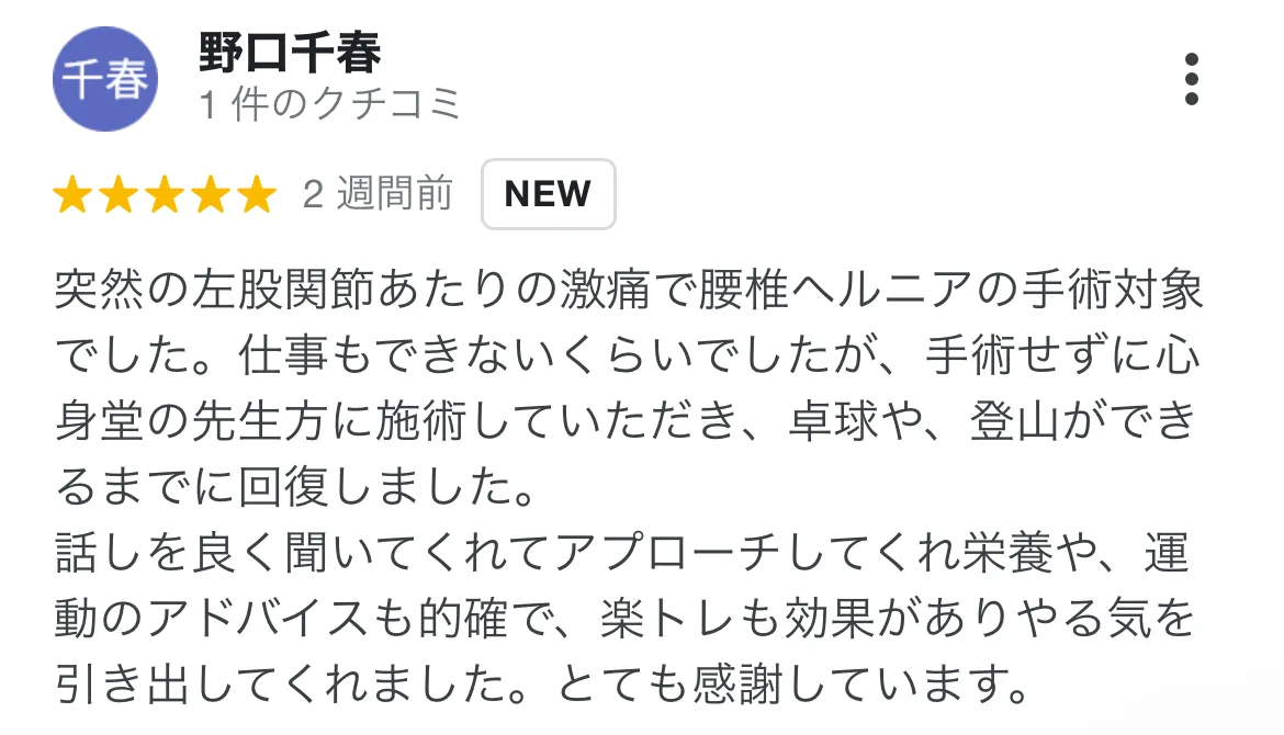 整形外科に行き、MRIを受診し、電気治療や注射をしたりしていました。しかし、症状は日々悪化していくばかりで、不安と痛みにくれていました。 そんな中、テスト整骨院さんのしっかりとしたカウンセリングと丁寧な説明が希望の光でした。実際に通い始めてからは、歩ける距離も増え、心もカラダも日々楽になっていきました。本当にありがとうございます。