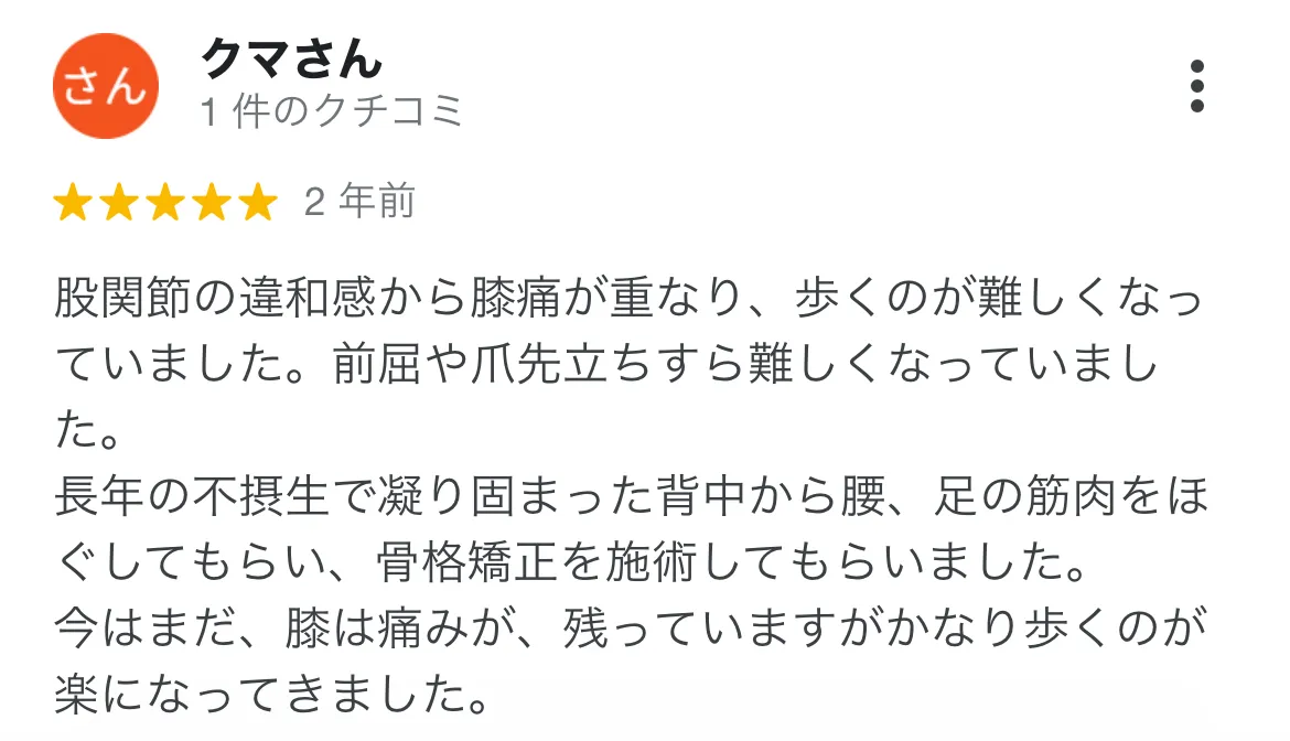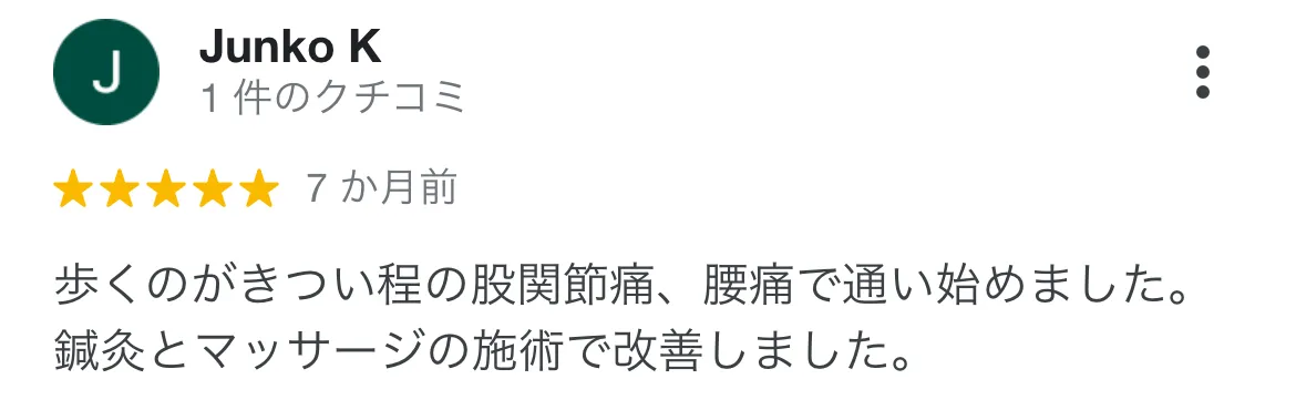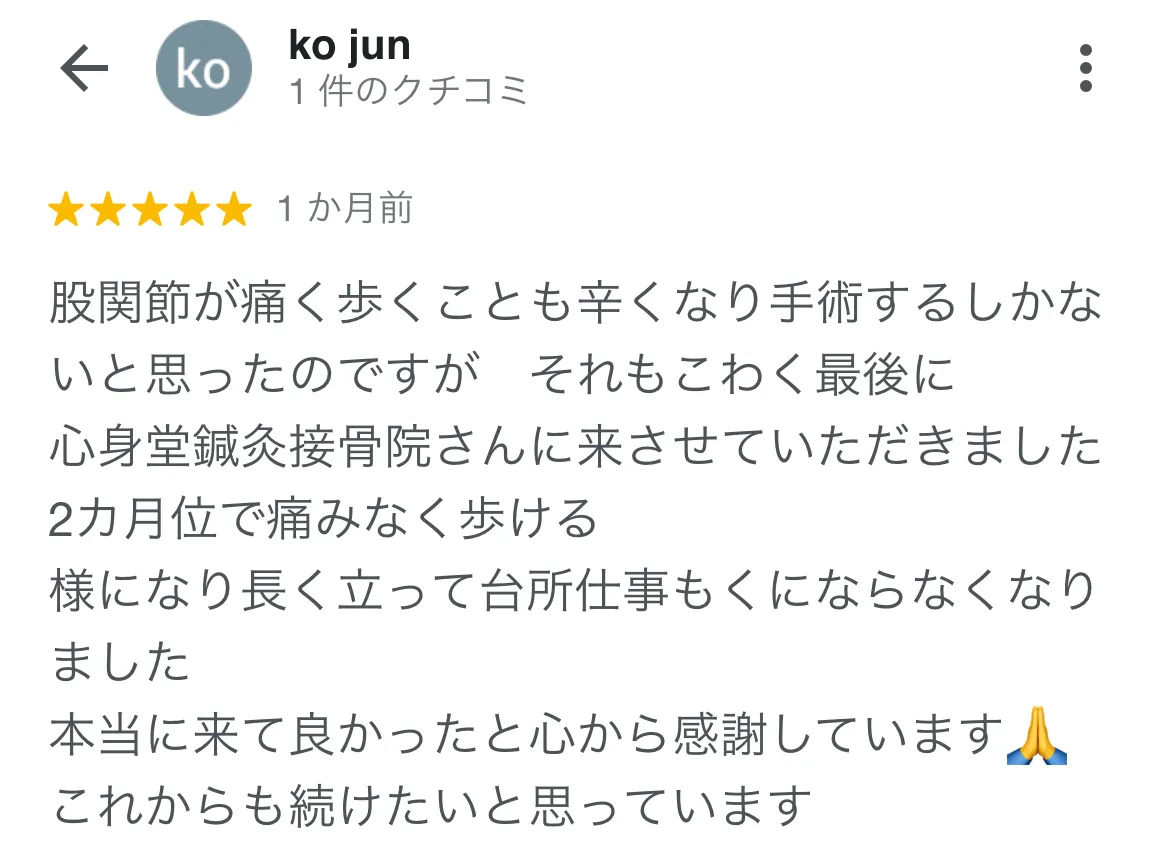 通院前は股関節から足先まで痛くて、杖がないと歩けない状態でした。整形外科に通ったこともありましたが、何も変化を感じられず非常に困っていました。 そんな中、テスト整骨院さんに出会い、親身になって症状改善に取り組んでくださり、今では杖なしで歩けています。 知り合いからも「足がむくまなくなったね」と言ってもらえるようになり嬉しい気持ちでいっぱいです。 どこにいっても治らないと諦めかけている方は、ぜひテスト整骨院さんに足を運んでみて下さい。