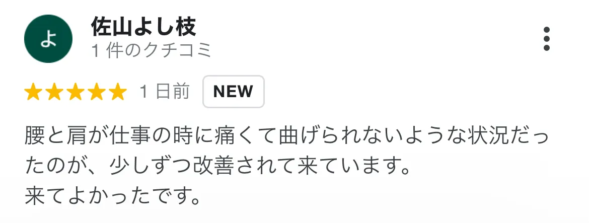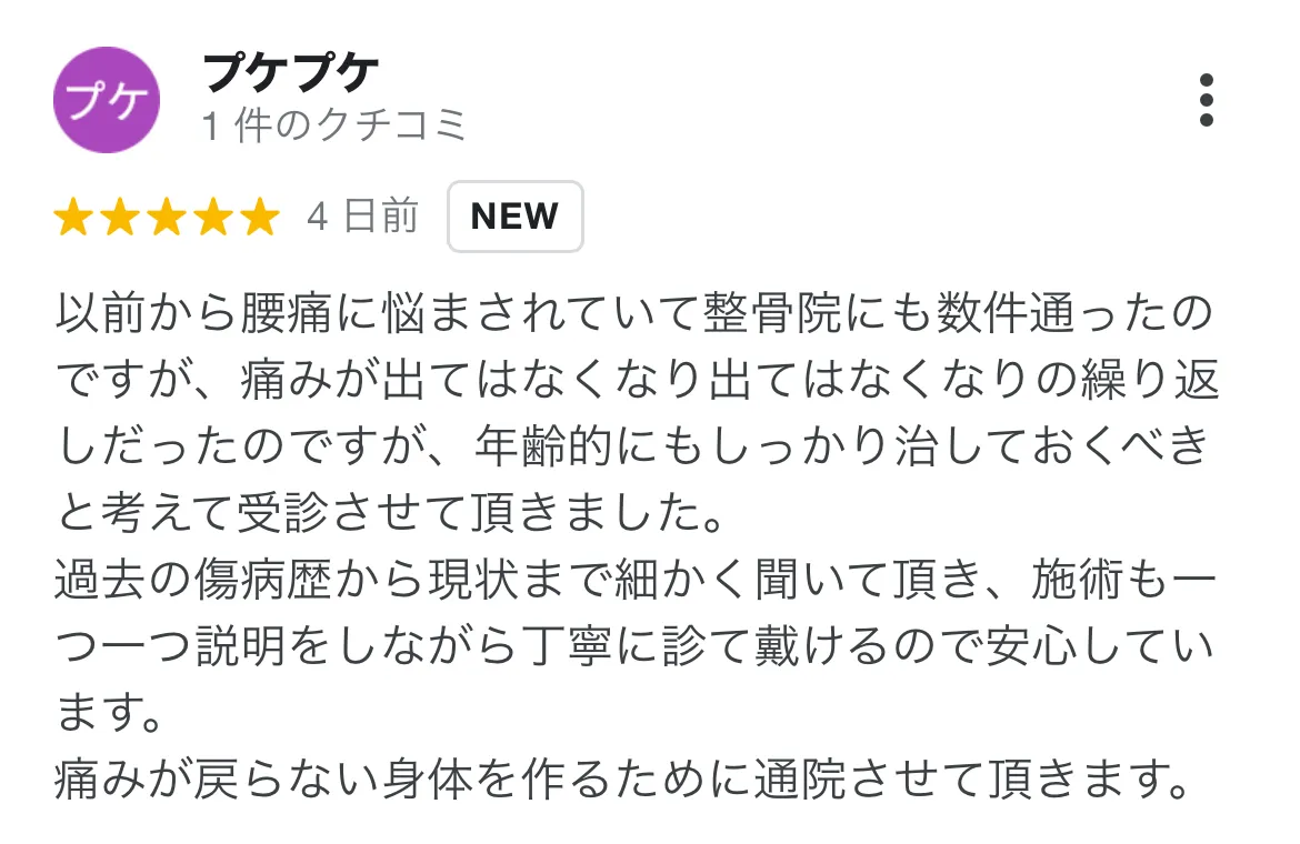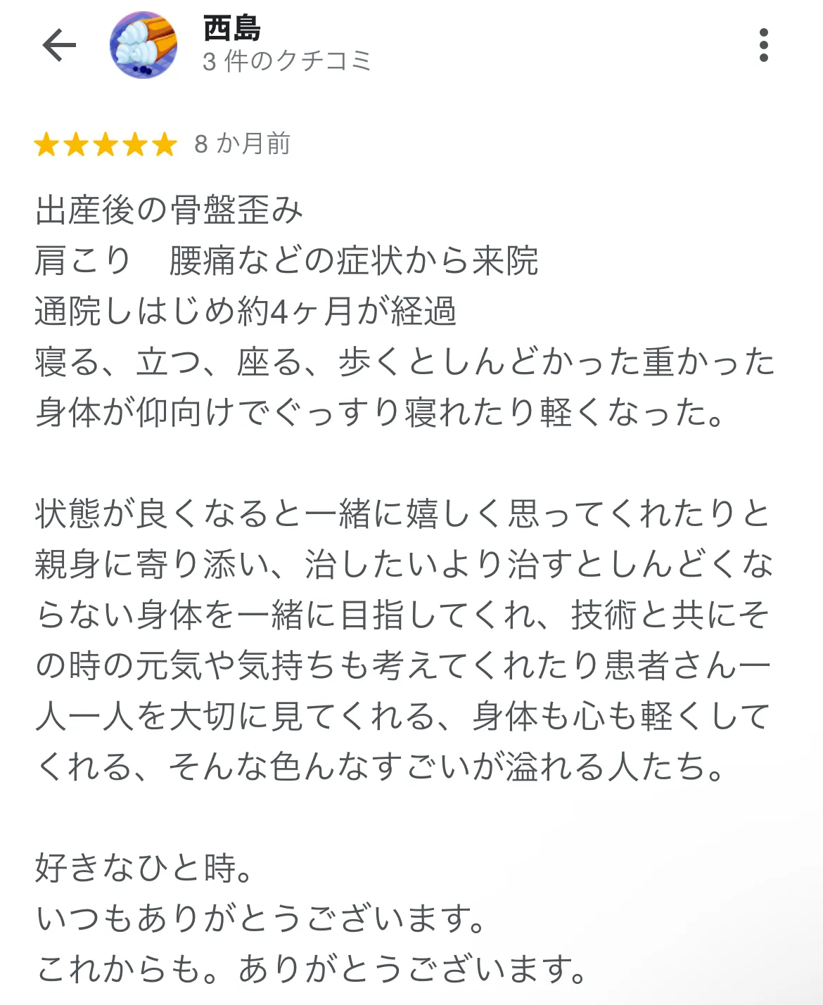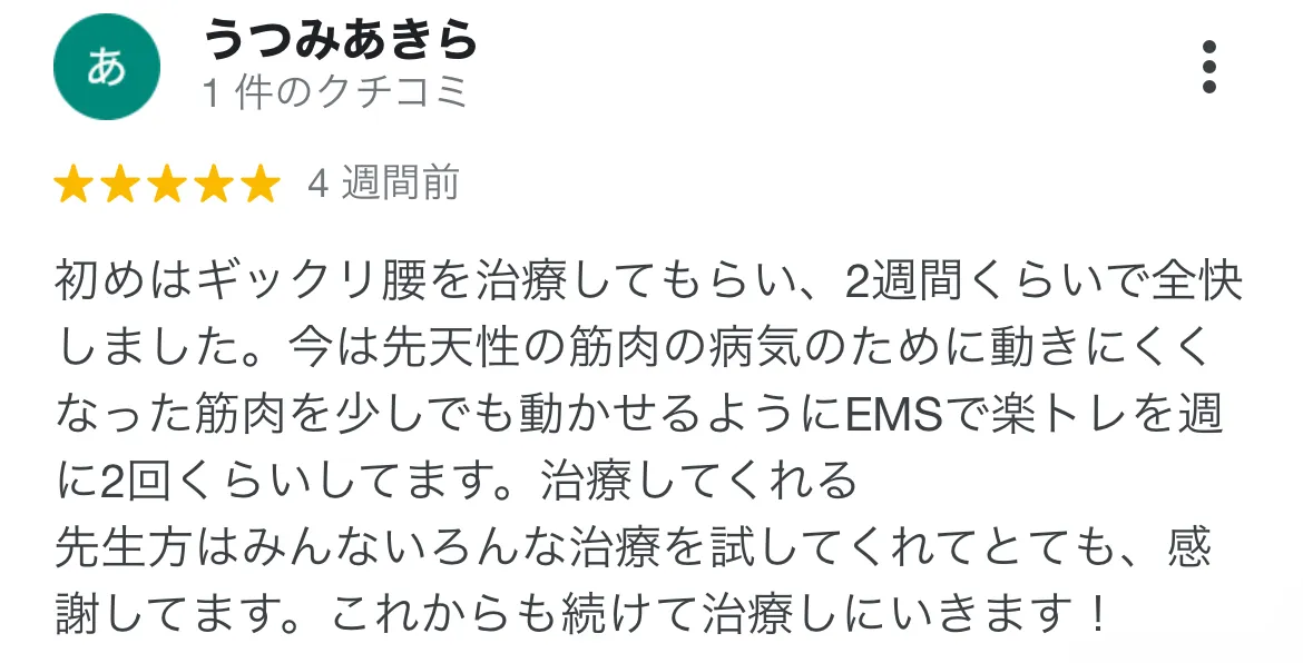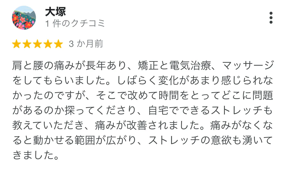 強い腰の痛みとギックリ腰でテスト整骨院さんにお世話になりました。はじめて姿勢写真を取って説明していただき、なぜ痛みが繰り返すのかを教えてもらいました。 今はギックリ腰が改善してきたので、外反母趾や肩首の治療をしてもらっています。